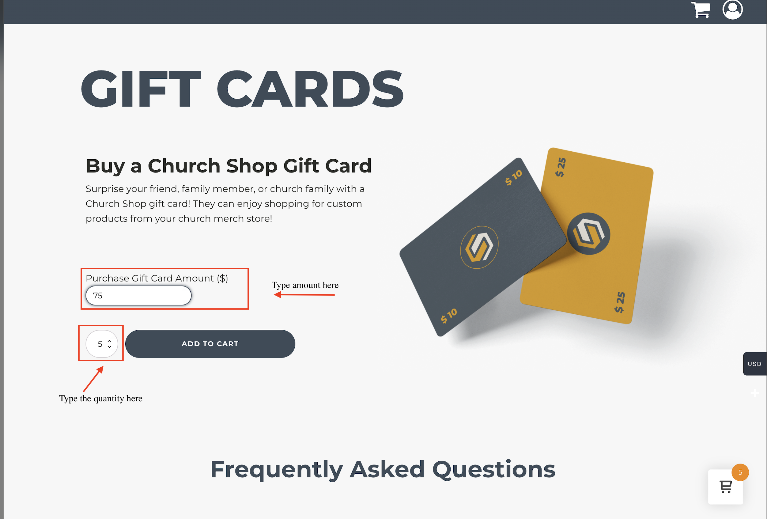 Gift Cards are a simple and flexible way to offer store credit to your congregation, staff, volunteers, or guests. Gift cards can be used toward products and shipping across your store.