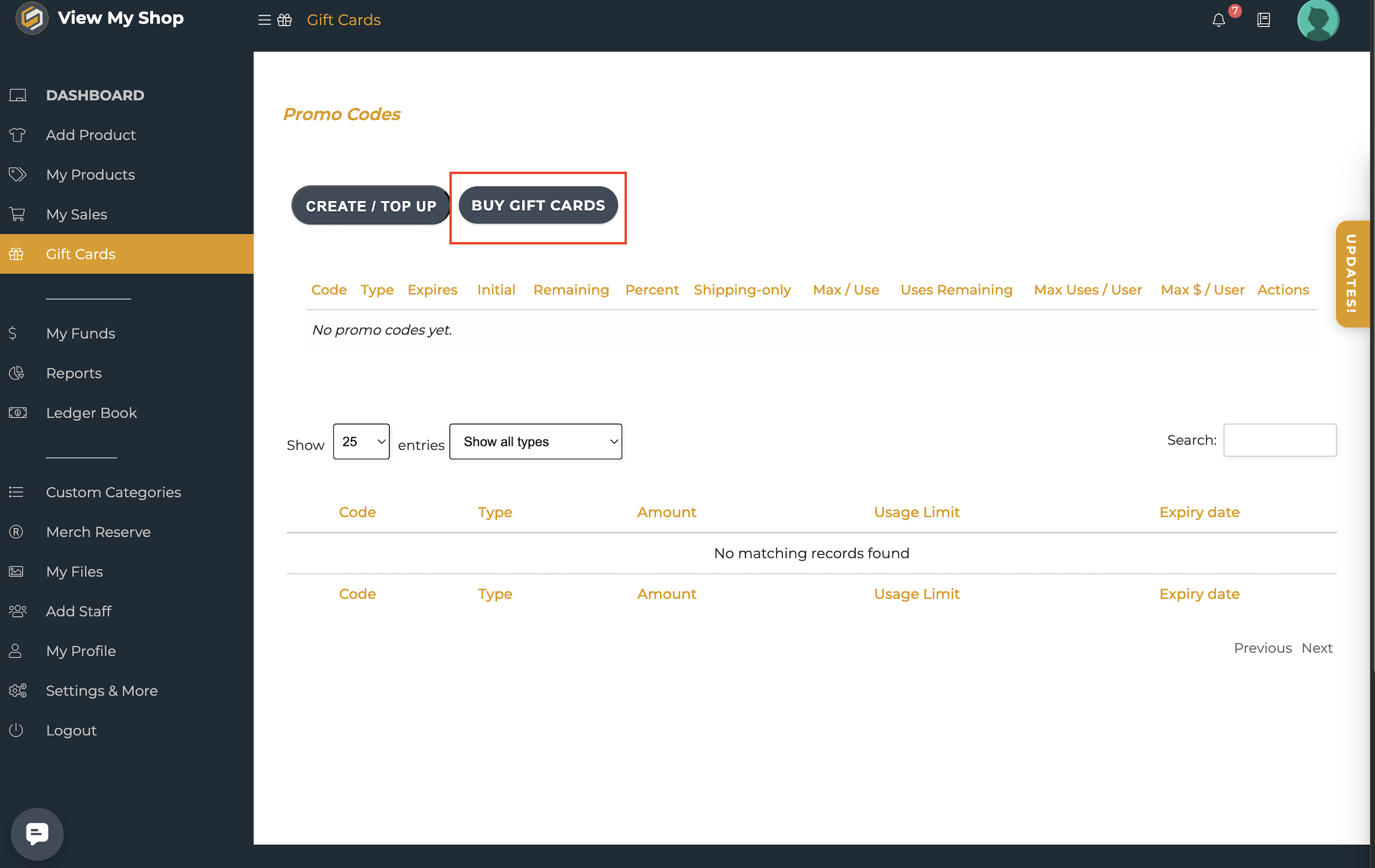If you’re an admin, you can also access gift cards directly from your dashboard:
